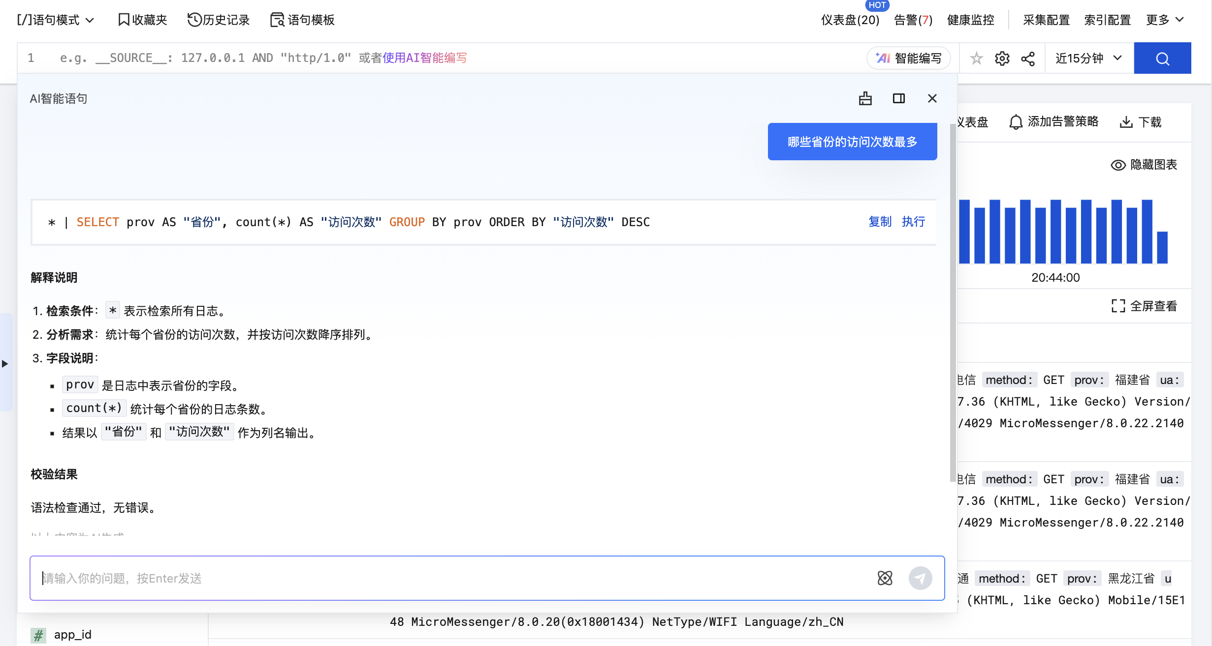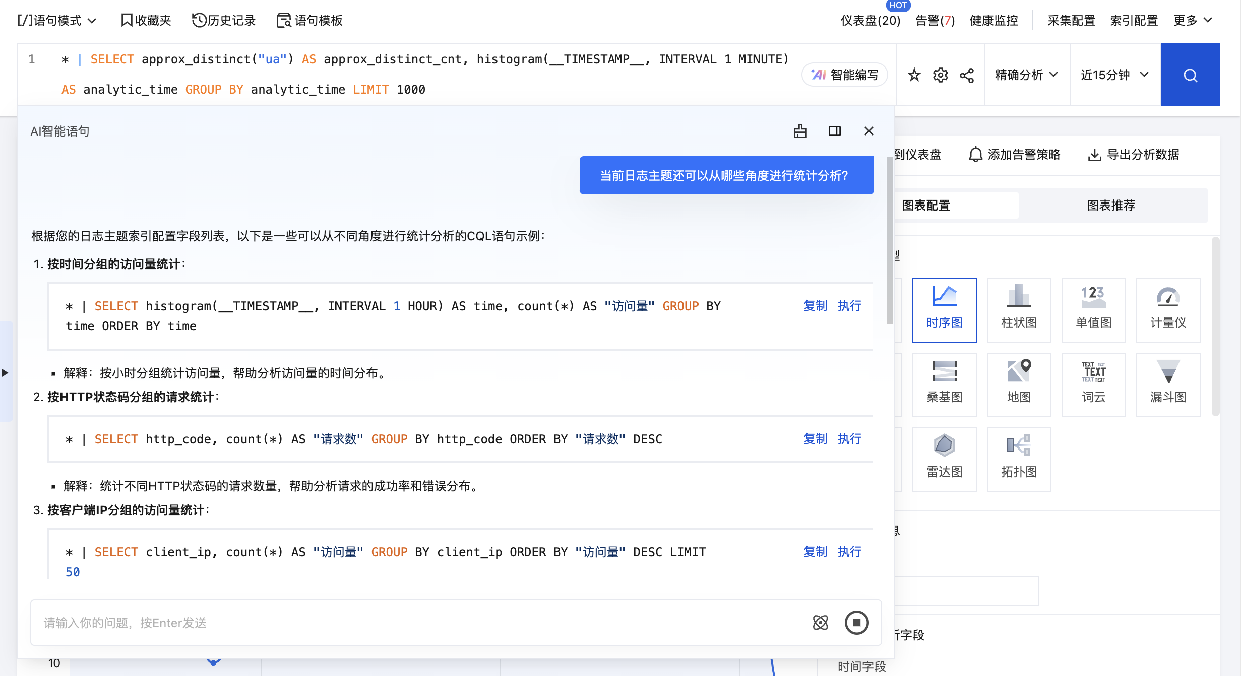 探索更多日志分析角度:针对指定日志主题自动推荐日志分析角度及对应语句。