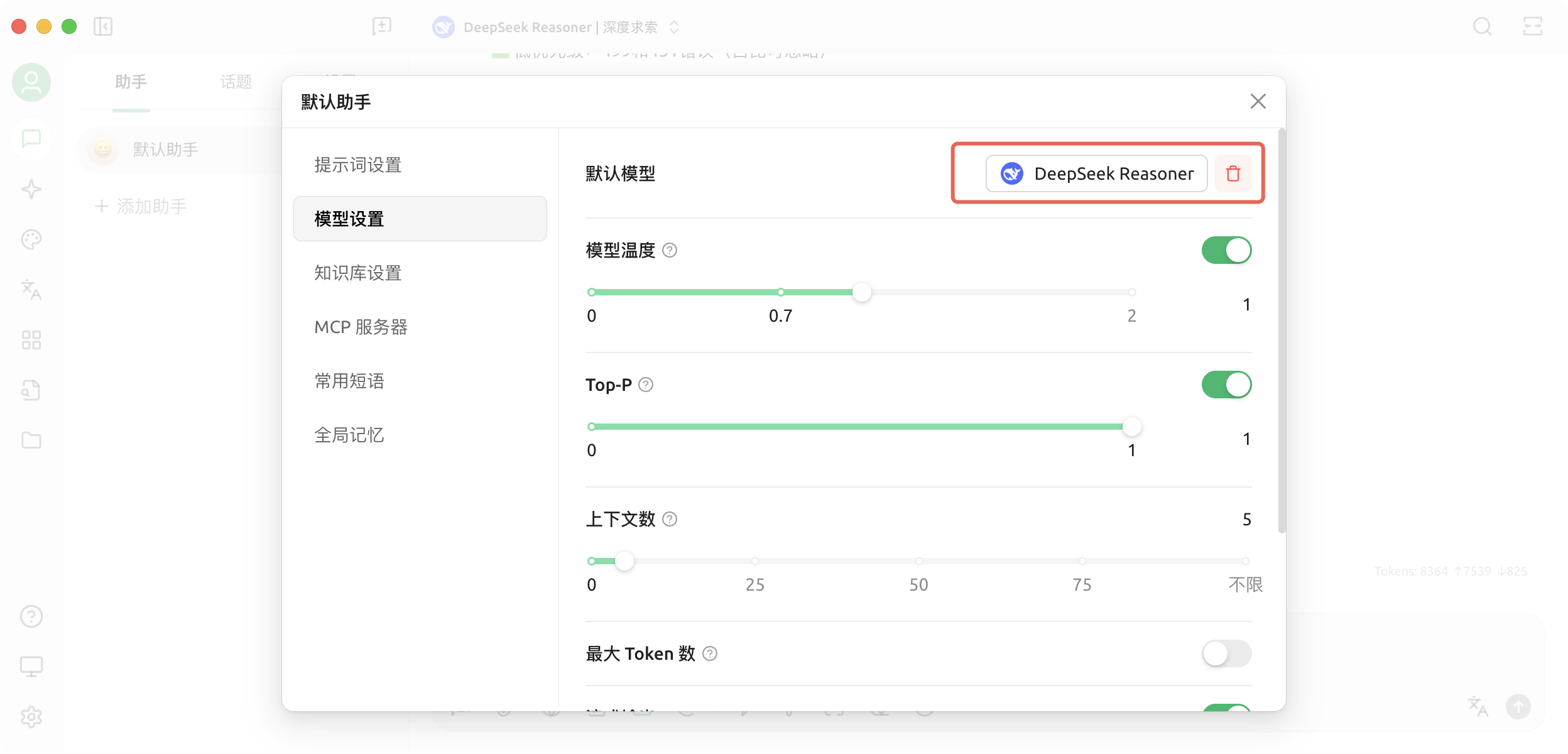 在模型设置中选择合适的模型(首次使用 Cherry Studio 时,请提在 Cherry Studio 设置菜单中配置模型服务):