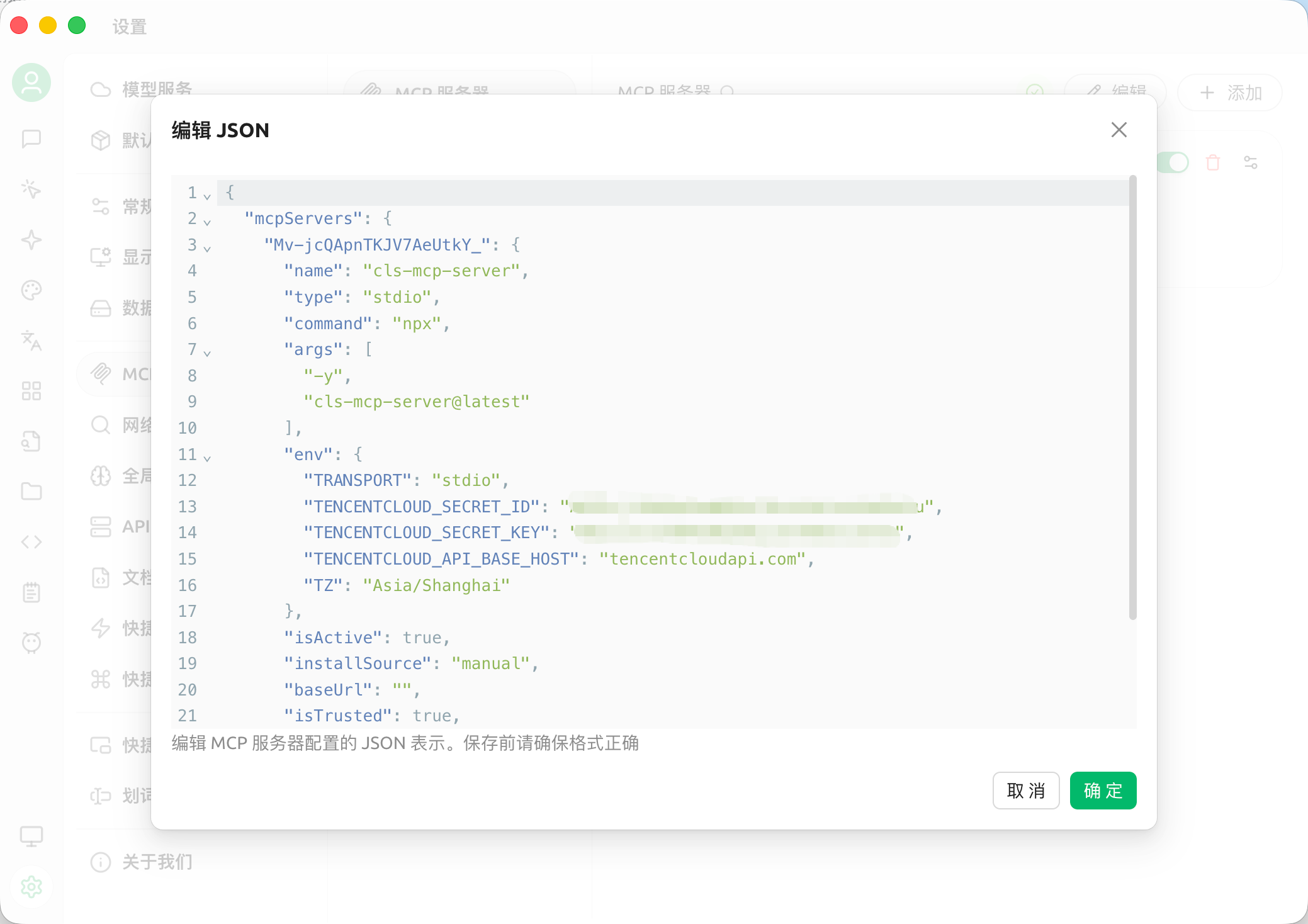 1. 在设置 > MCP 服务器中编辑 JSON 配置,添加上述 JSON 配置,然后单击确定保存配置。