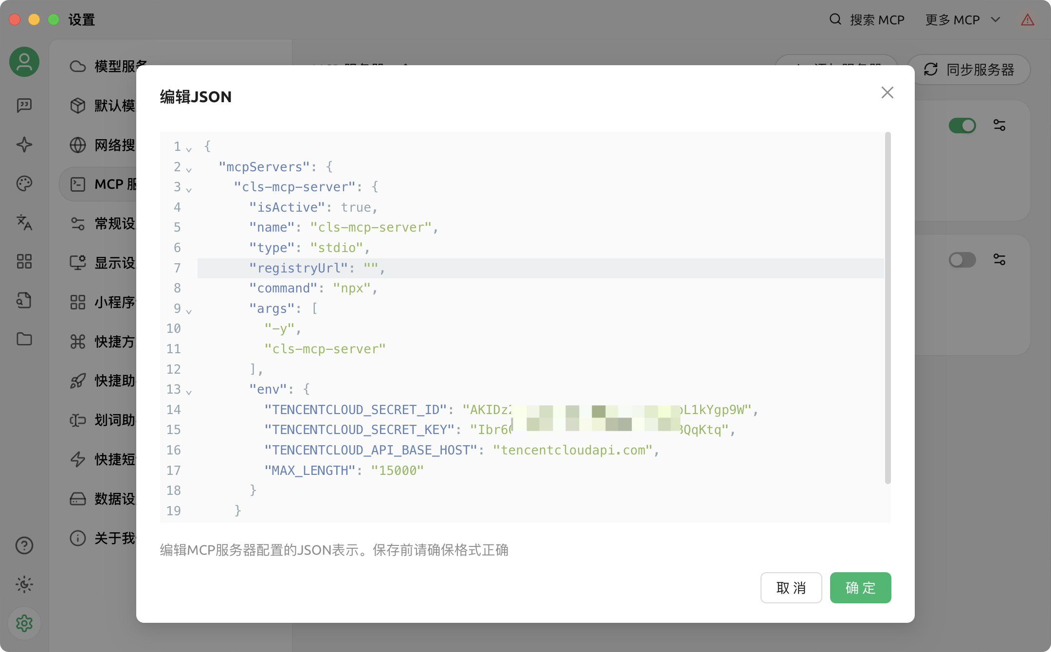 1. 在设置 > MCP 服务器中编辑 JSON 配置,然后单击确定保存配置。