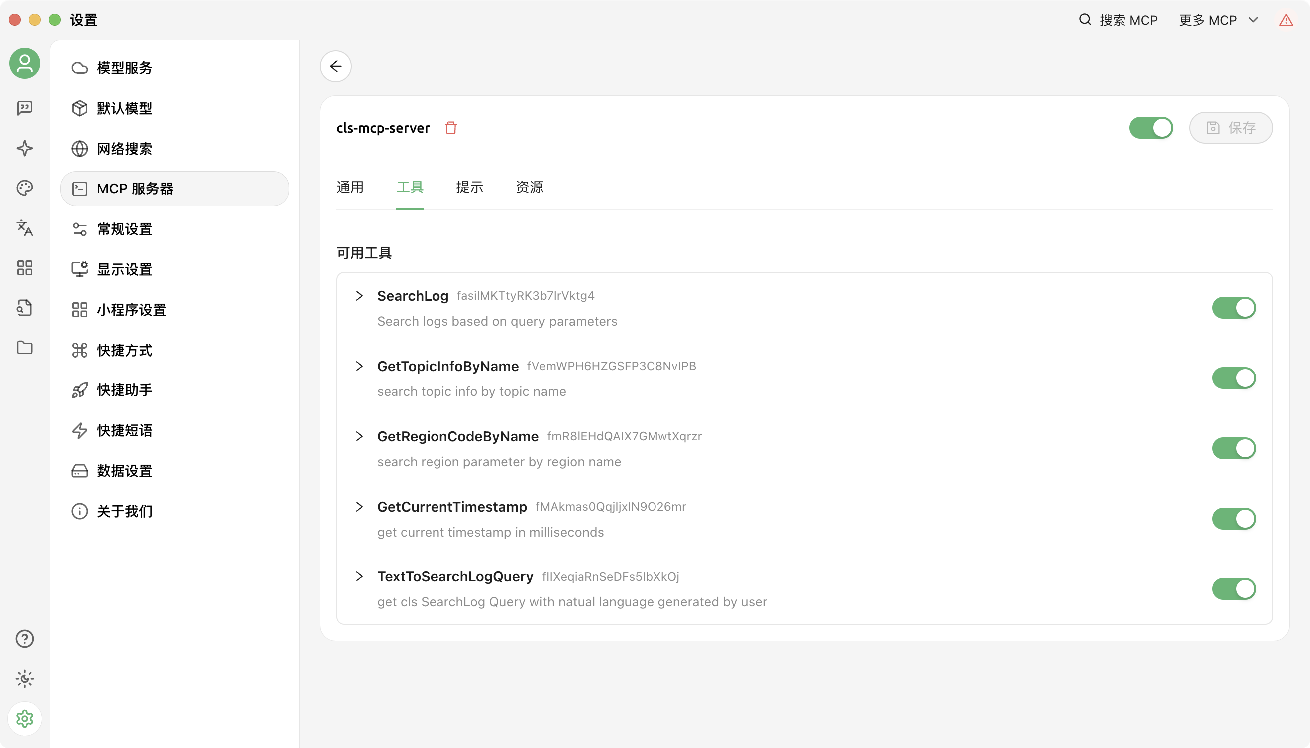 2. 保存配置后,单击 cls-mcp-server > 工具,如果能查看到可用工具列表,说明安装成功。