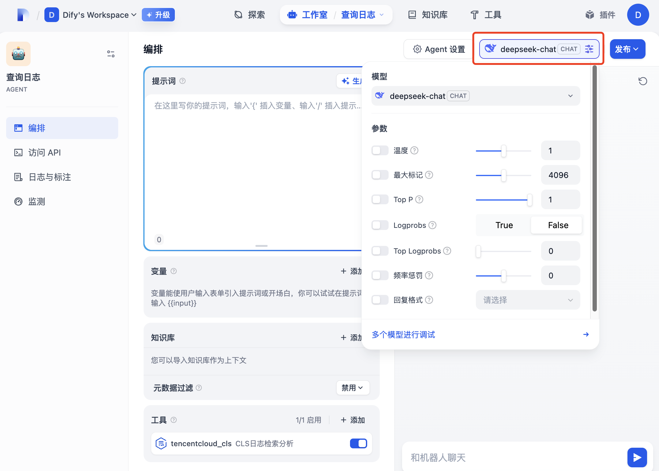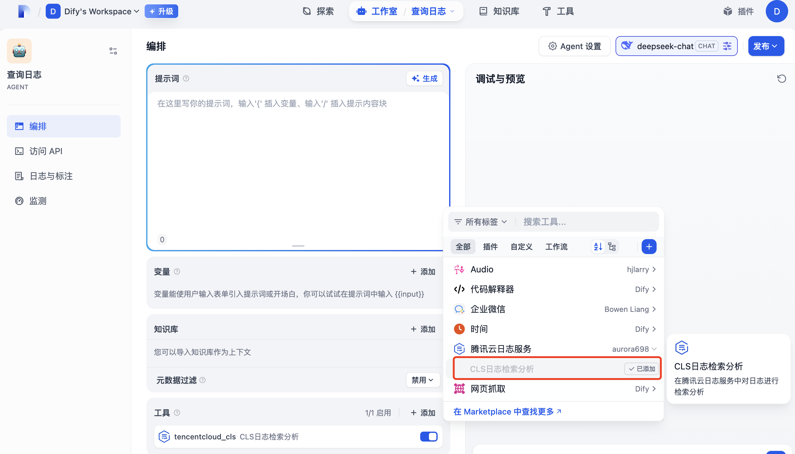 2. 在底部的工具中添加腾讯云日志服务 > CLS 日志检索分析。