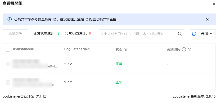 LogListener 离线自动剔除策略:请参见 机器离线自动剔除。