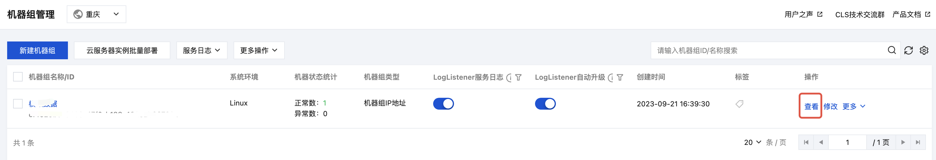 3. 在机器组管理页面,找到需要操作的机器组,单击查看。