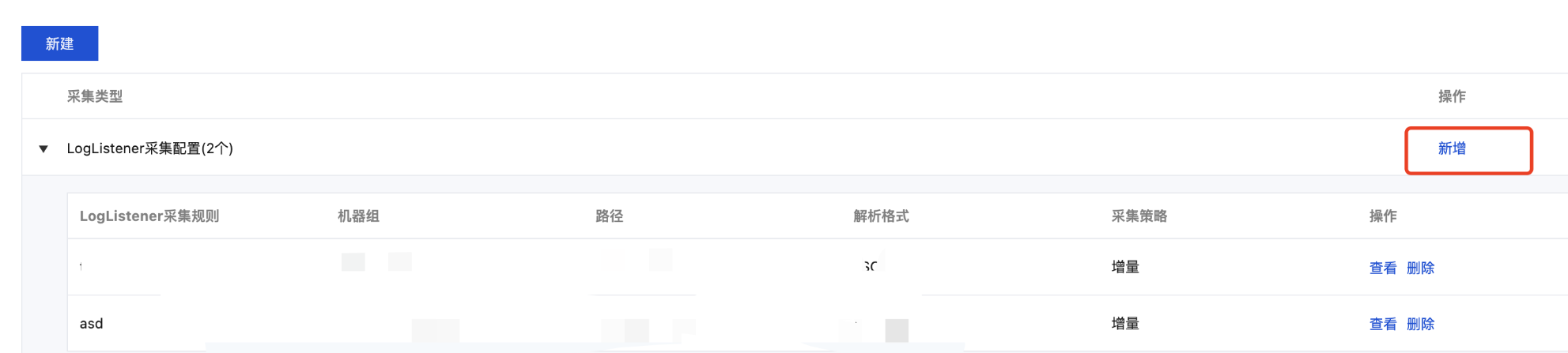 3. 选择采集配置页签,在 LogListener 采集配置栏下单击新增,进入日志数据源选择。