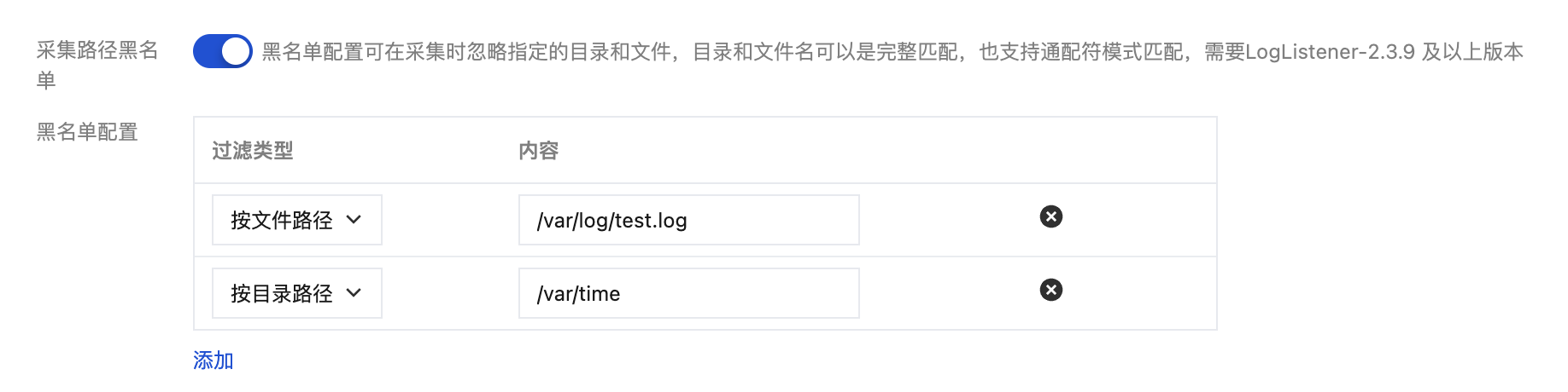 开启采集路径黑名单,可在采集时忽略指定的目录前缀或完整的文件路径。目录路径和文件路径可以是完全匹配,也支持通配符模式匹配。