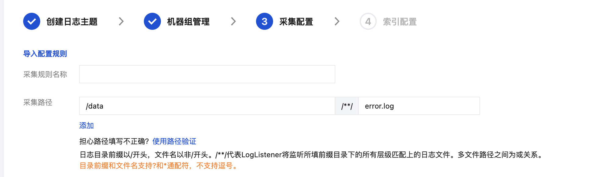 在“采集配置”页面,填写采集规则名称,并根据日志采集路径格式填写“采集路径”。日志采集路径格式参考如下: