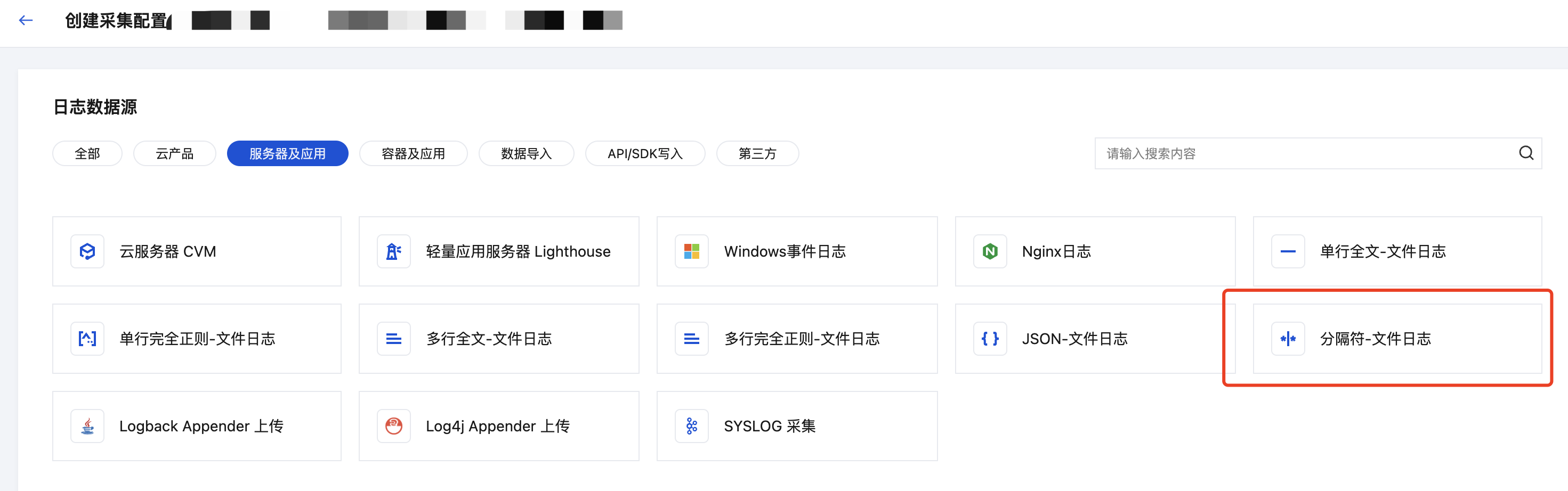4. 在日志数据源选择页面中,选择服务器及应用,找到并单击分隔符-文件日志,进入采集配置流程。