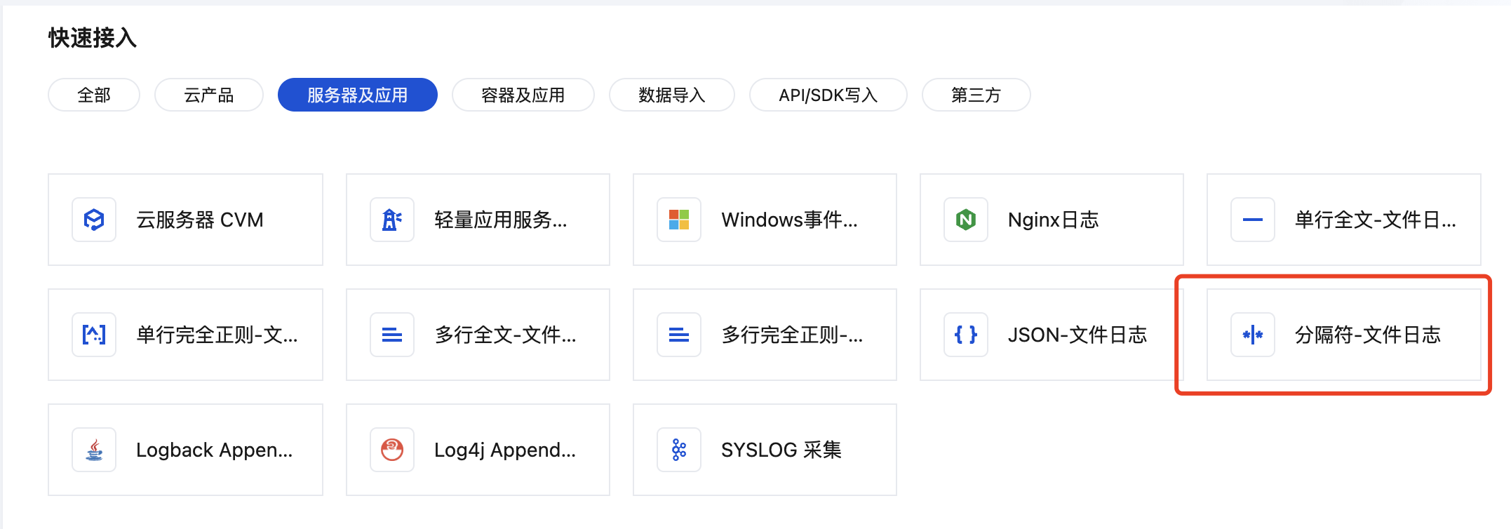 3. 在快速接入中,选择服务器及应用,找到并单击分隔符-文件日志,进入采集配置流程。