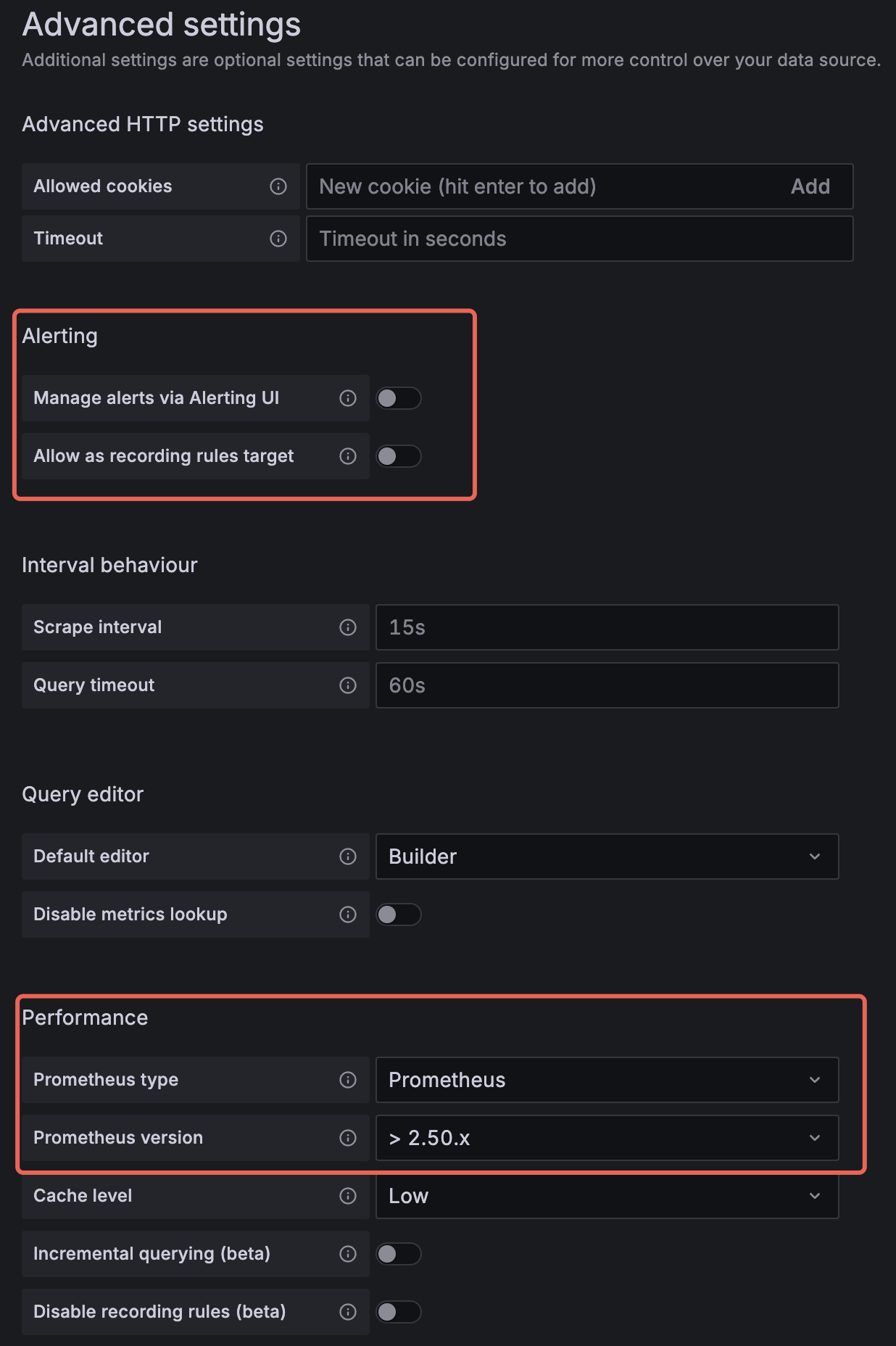 Prometheus version:> 2.50.x(旧版本 Grafana 可能无该配置项,可忽略,但在数据量较大时会影响查询性能,此时建议升级 Grafana)。