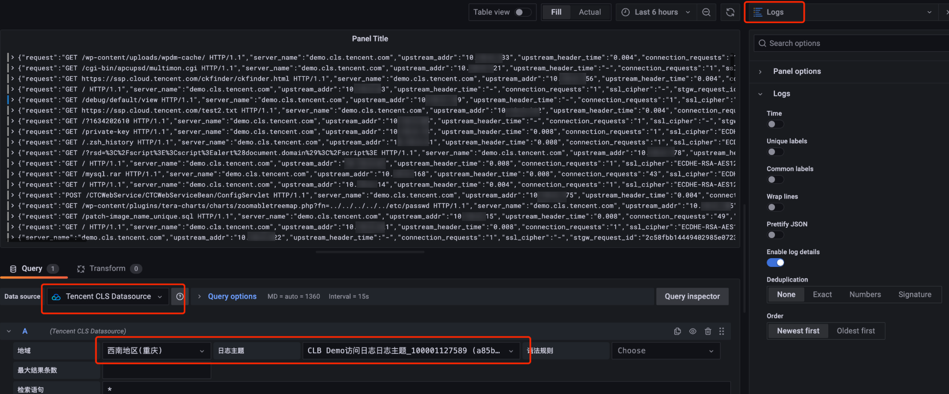 2. 在图表编辑页面,图表类型选择 Logs。数据源选择 Tencent CLS Datasource 插件,选择目标日志主题的所在地域、日志主题名称。