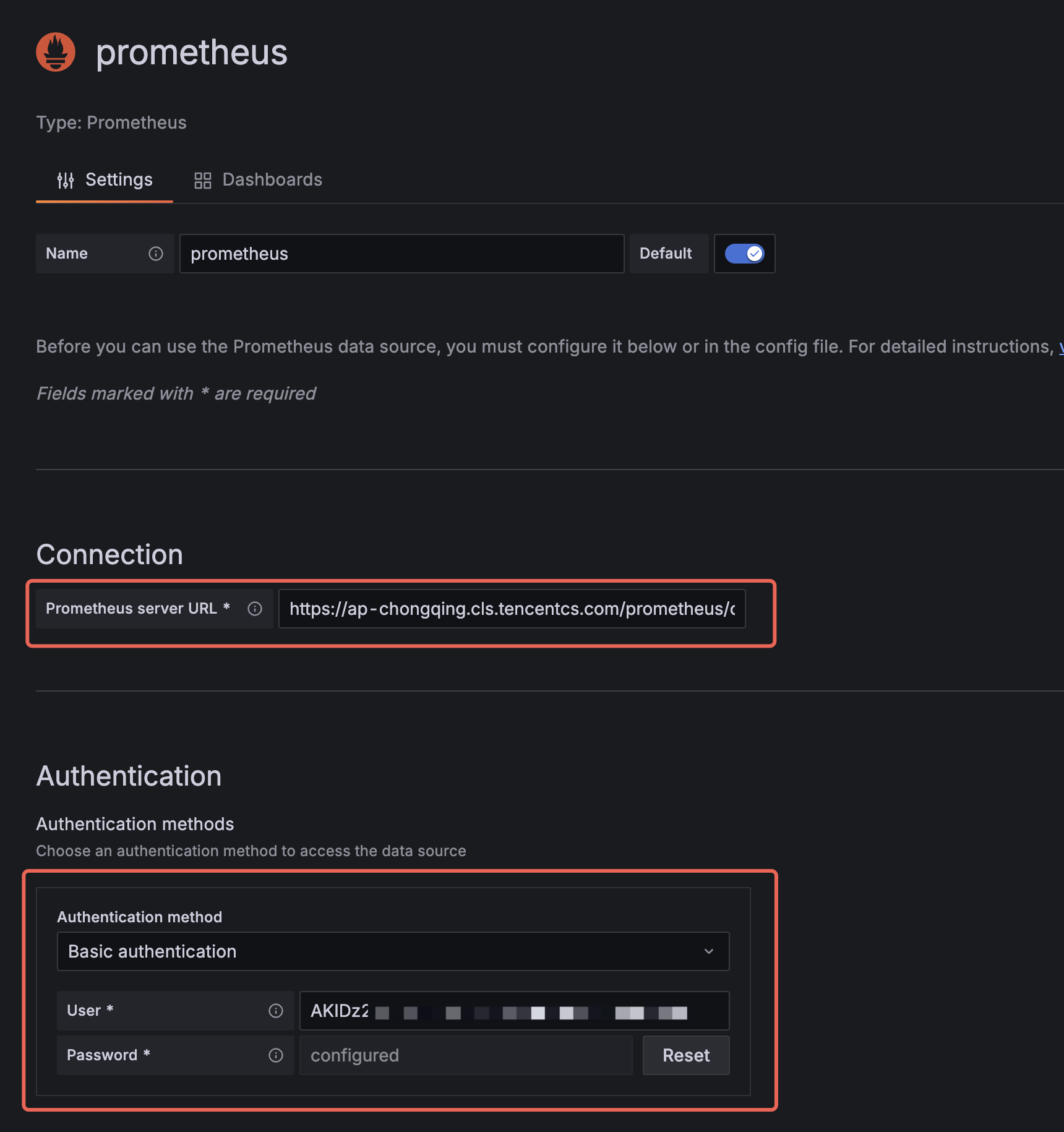 Prometheus server URL:即第1步获取配置信息中的 URL,Grafana 部署在腾讯云内网时(例如部署在 CVM 或 TKE 中)可使用内网地址,其它情况请使用外网地址。