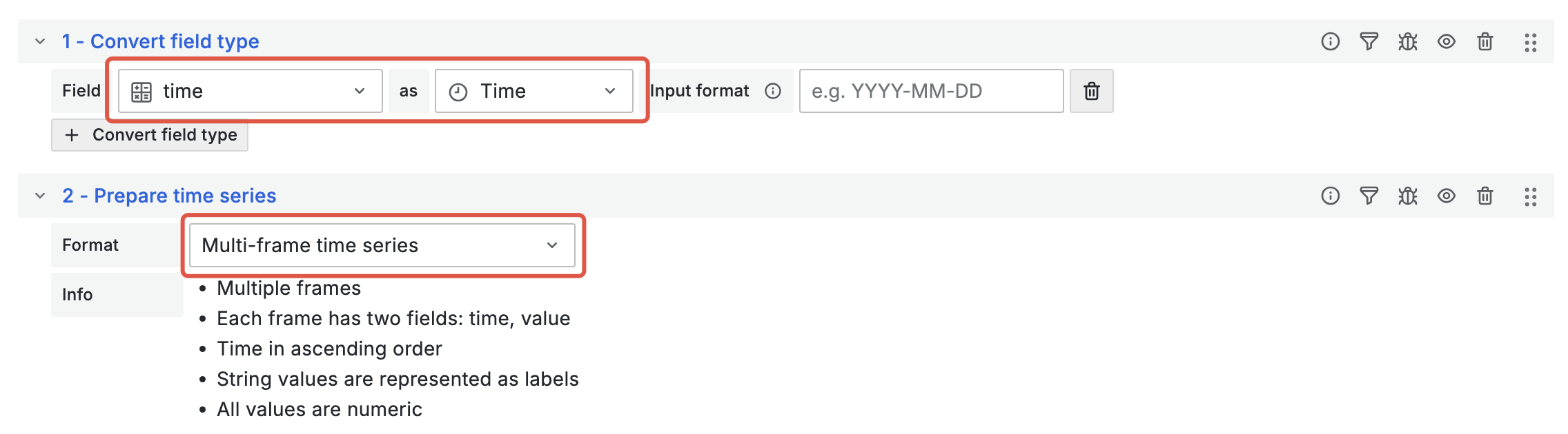 该语句需要配合 Transform 功能绘制时序图,添加 Convert field type 和 Prepare time series 配置如下: