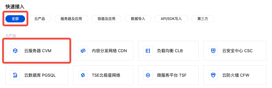 3. 在快速接入中,找到全部,单击云服务器 CVM,进入采集配置流程。