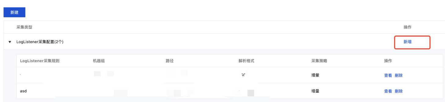 3. 选择采集配置页签,在 LogListener 采集配置栏下单击新增,进入日志数据源选择。