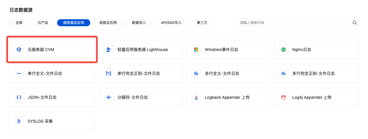4. 在日志数据源选择页面中,选择服务器及应用,找到并单击云服务器 CVM,进入采集配置流程。