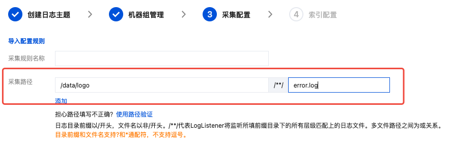 在“采集配置”页面,根据日志采集路径格式,填写“采集路径”。如下图所示: