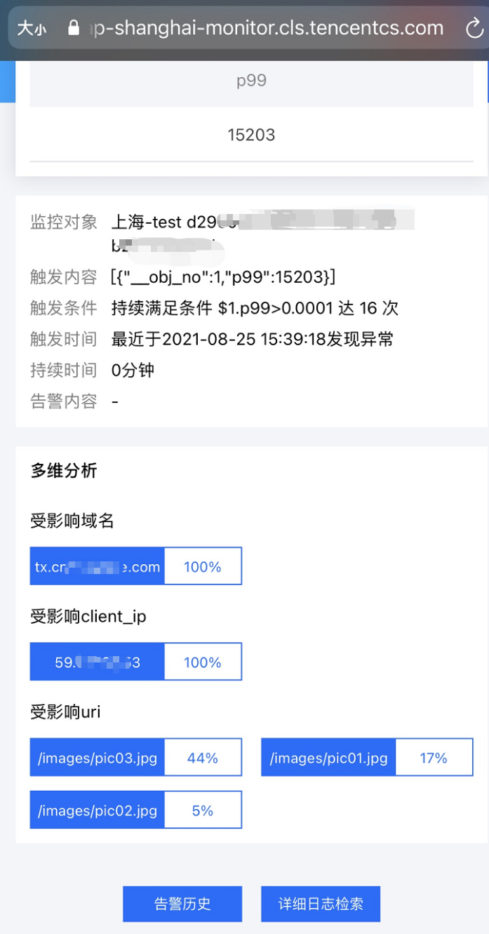 多维分析:在告警信息中展示受影响的域名、客户端 IP、url,帮助开发人员快速定位问题。