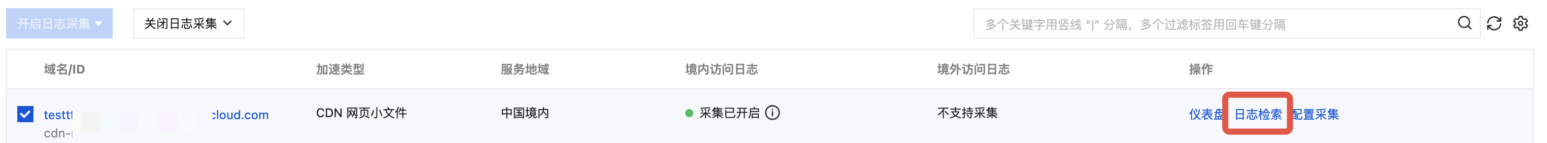 1. 完成开启域名访问日志采集后,在域名列表中,找到已开启访问日志采集的域名,单击日志检索。