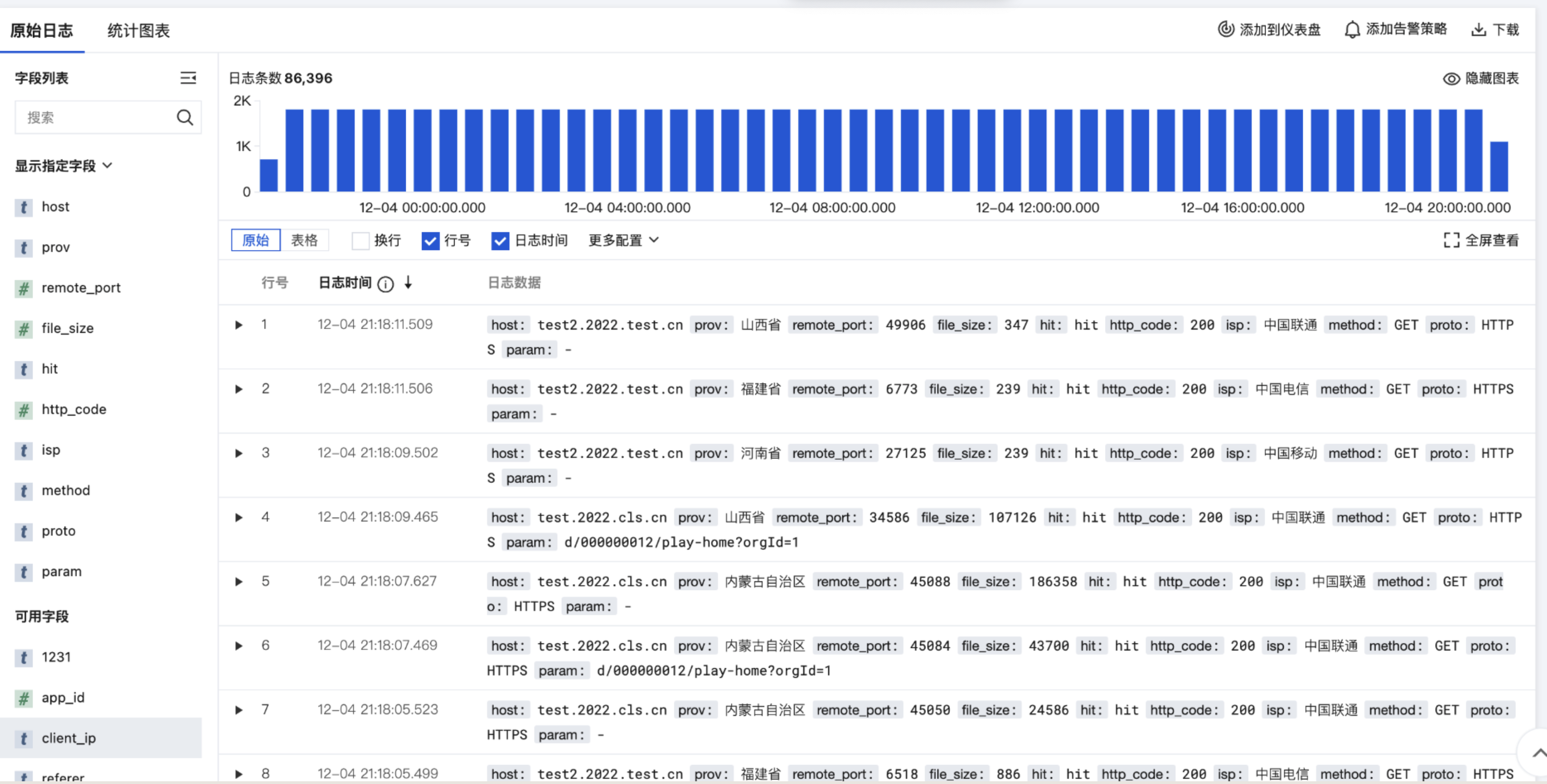 2. 单击后将跳转至日志检索页,即可检索分析访问日志。日志字段的详细介绍请参见 日志字段说明。