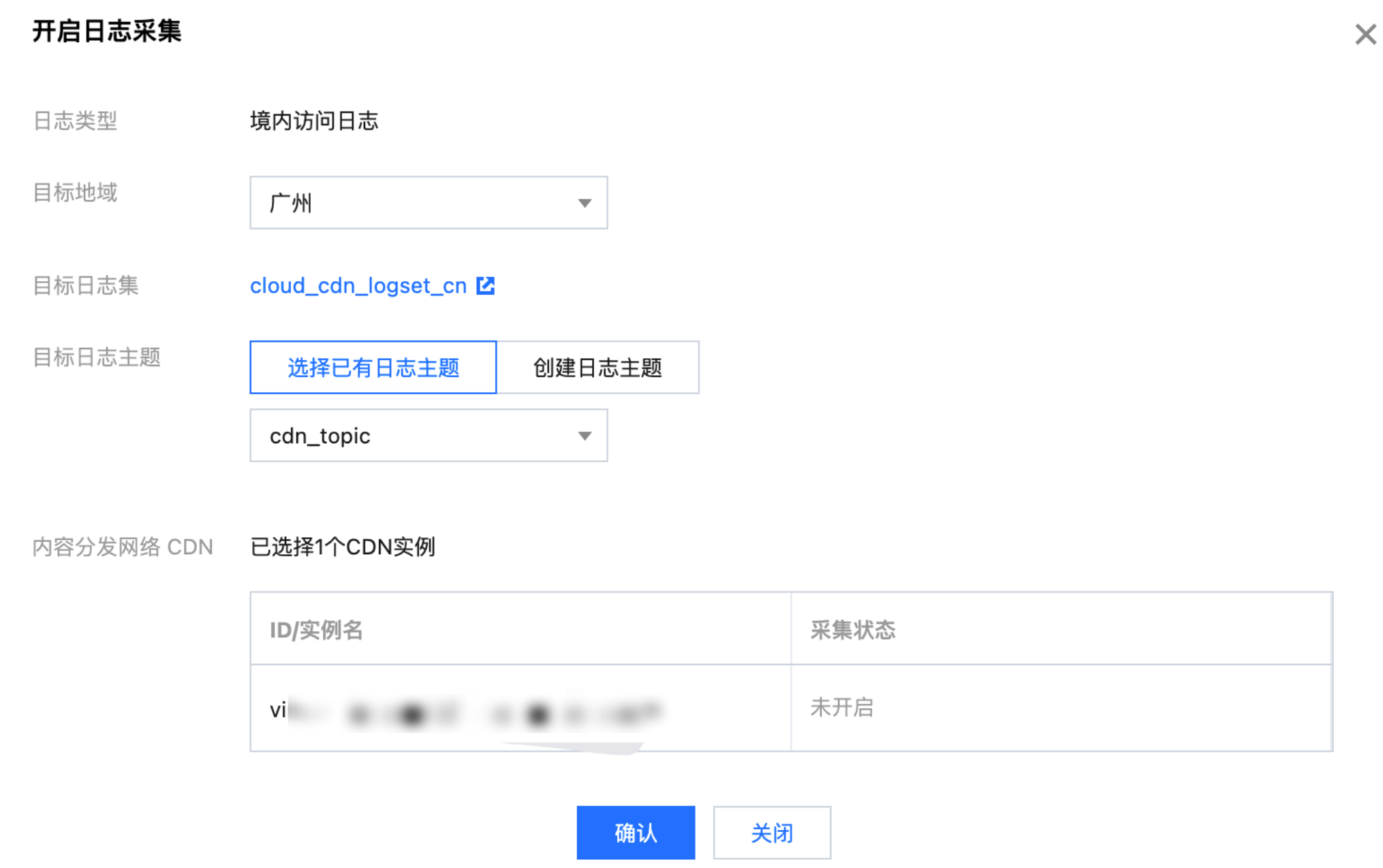 4. 在开启日志采集弹窗中,选择已有日志主题或 创建目标日志主题,并单击确认。