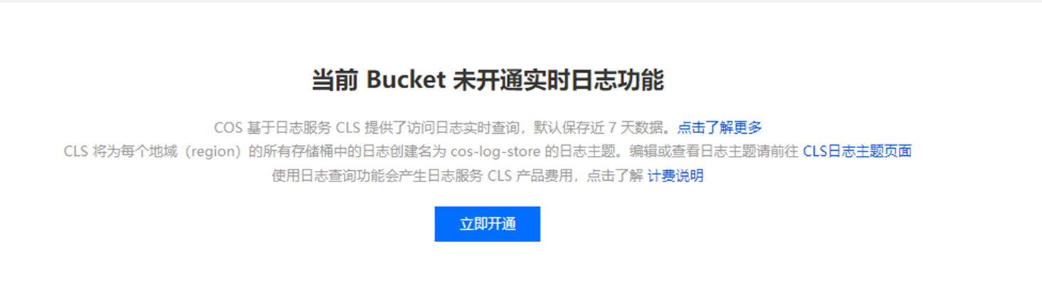 5. 页面将提示“当前 Bucket 未开通实时日志功能”, 单击立即开通开启。