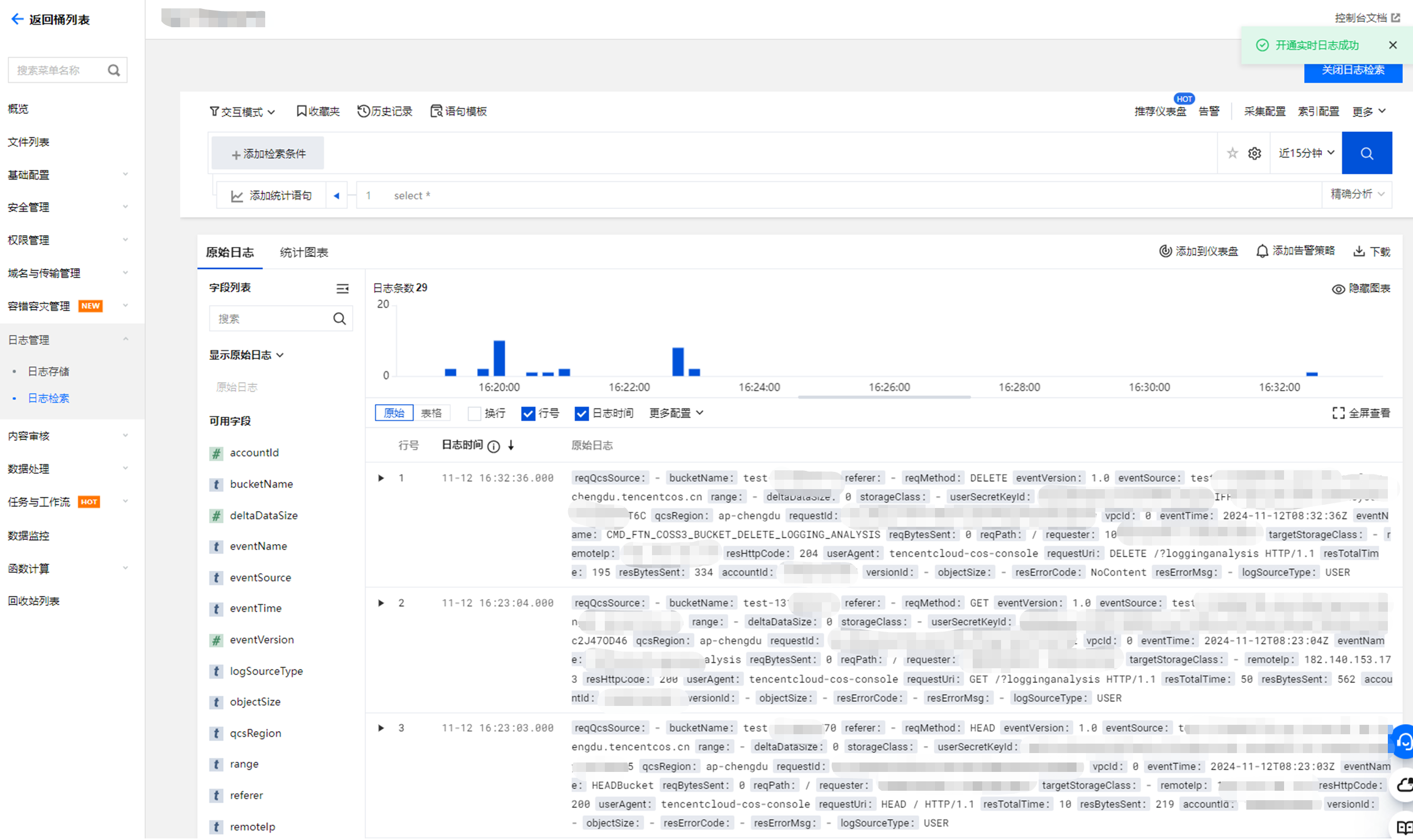 您可以登录对象存储(Cloud Object Storage,COS)控制台,为存储桶开启 CLS 日志服务的实时日志功能。 CLS 提供存储桶对象操作相关的各种请求日志的分钟粒度的上报、实时检索、可视化与告警的强大功能。 开启实时日志功能,可以帮助您更好的分析当前存储桶的访问情况,并且在访问异常时,快速定位问题。