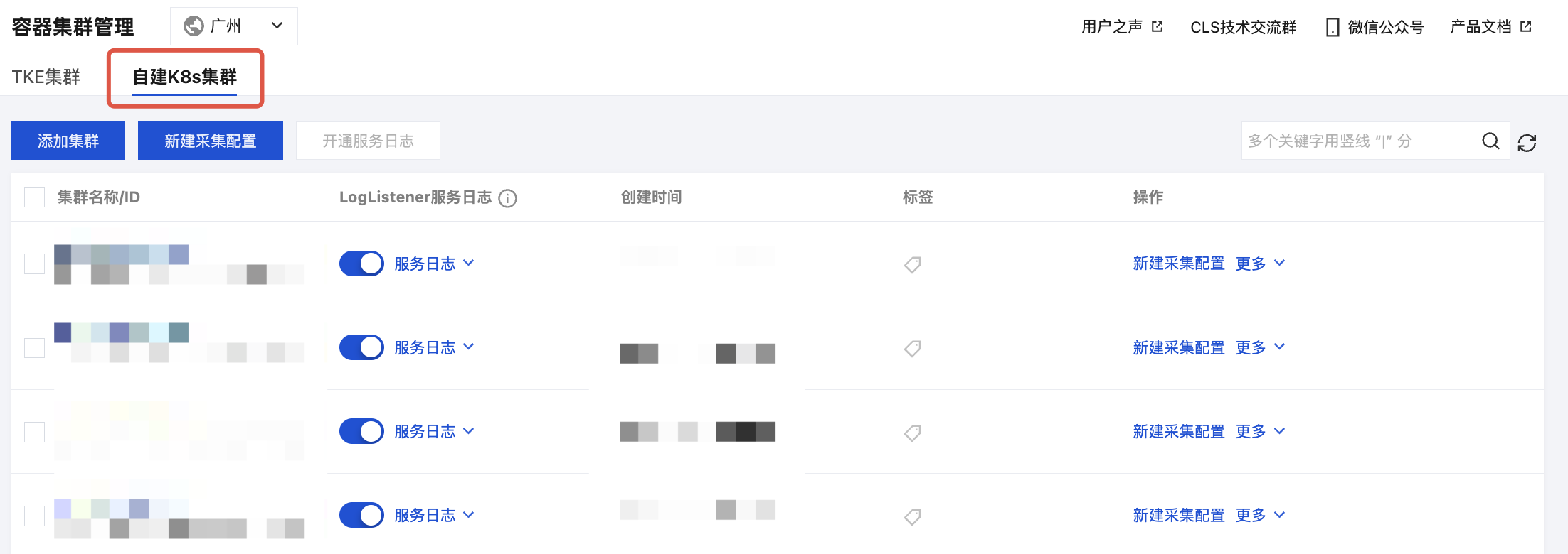 4. 若您已完成 自建 K8s 集群安装 LogListener,CLS 将会自动在您安装时指定的 CLS 地域下,创建一个集群。