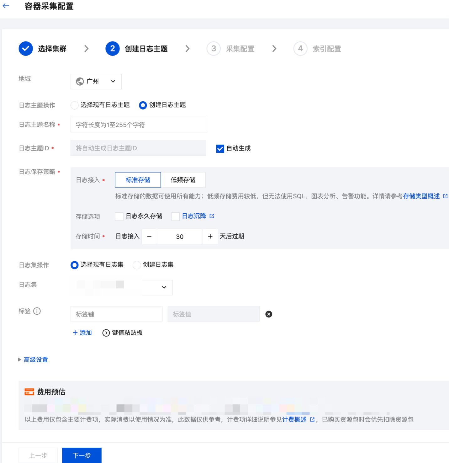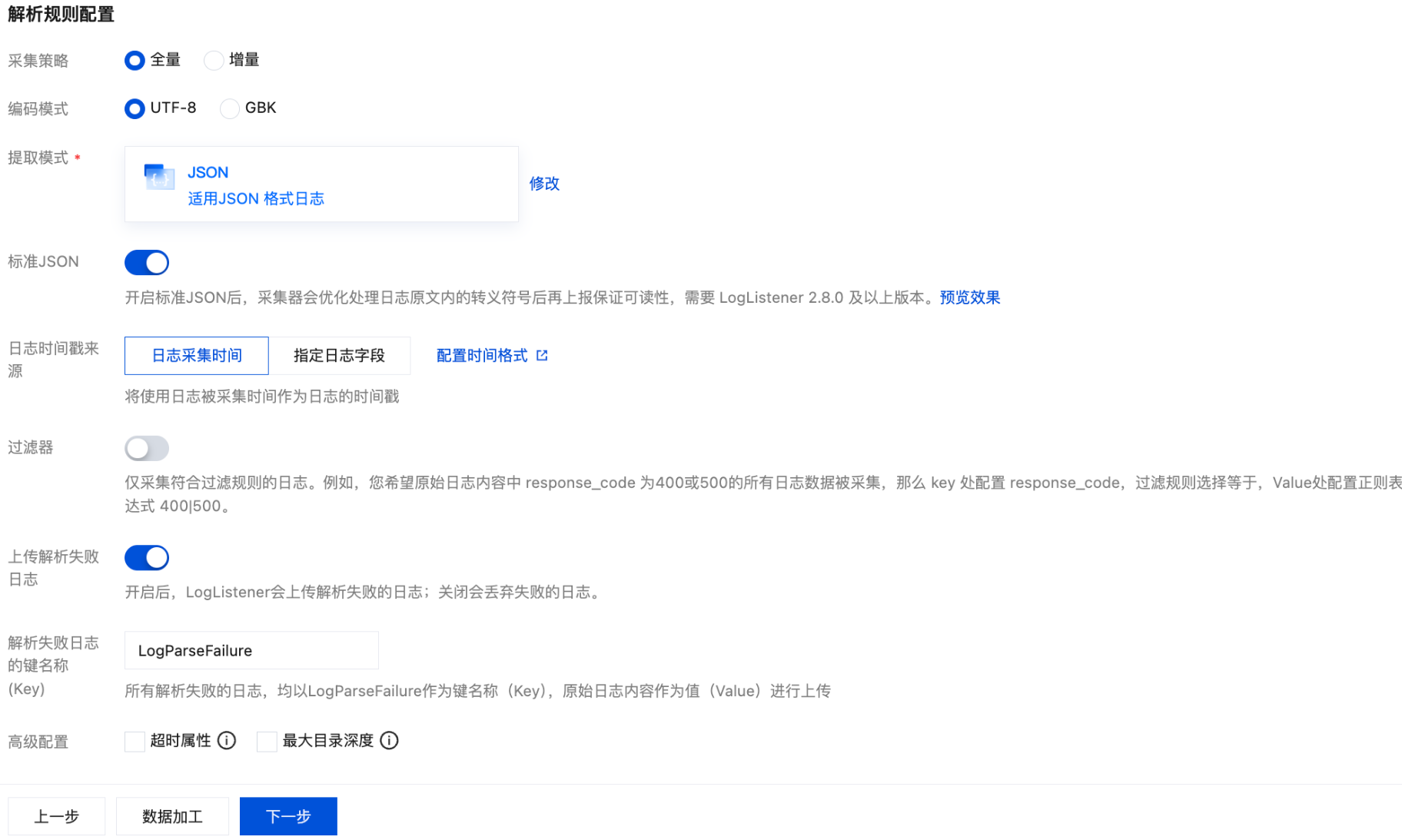 完成日志主题的配置后,单击下一步进入采集配置即可配置采集规则,配置信息如下: