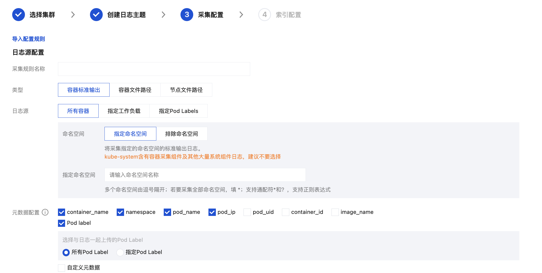 所有容器:代表采集指定命名空间下的所有容器中的标准输出日志,如下图所示: