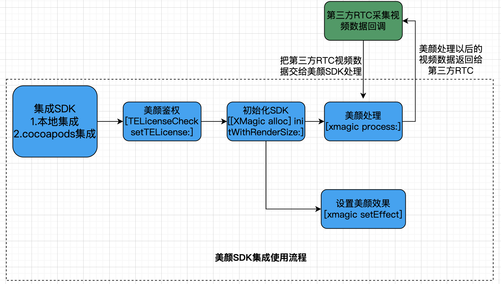 /**以设备摄像头数据输出为例*///sampleBuffer:设备摄像头输出的数据-(CMSampleBufferRef)didProcessCPUData:(CMSampleBufferRef)sampleBuffer{CVPixelBufferRef pixelBuffer = CMSampleBufferGetImageBuffer(sampleBuffer);YTProcessInput *input = [[YTProcessInput alloc] init];input.pixelData = [[YTImagePixelData alloc] init];input.pixelData.data = pixelBuffer;input.dataType = kYTImagePixelData;YTProcessOutput *output = [self.xMagicKit process:input];if (output.pixelData.data != nil) { //output.pixelData.data:美颜SDK处理以后的数据CMSampleBufferRef outSampleBuffer = [self sampleBufferFromPixelBuffer:output.pixelData.data];return outSampleBuffer;}return nil;}//PixelBuffer转sampleBuffer- (CMSampleBufferRef)sampleBufferFromPixelBuffer:(CVPixelBufferRef)pixelBuffer{CFRetain(pixelBuffer);CMSampleBufferRef outputSampleBuffer = NULL;CMSampleTimingInfo timing = {kCMTimeInvalid, kCMTimeInvalid, kCMTimeInvalid};CMVideoFormatDescriptionRef videoInfo = NULL;OSStatus result = CMVideoFormatDescriptionCreateForImageBuffer(NULL, pixelBuffer, &videoInfo);result = CMSampleBufferCreateForImageBuffer(kCFAllocatorDefault, pixelBuffer, true, NULL, NULL, videoInfo, &timing, &outputSampleBuffer);CFArrayRef attachments = CMSampleBufferGetSampleAttachmentsArray(outputSampleBuffer, YES);CFMutableDictionaryRef dict = (CFMutableDictionaryRef)CFArrayGetValueAtIndex(attachments, 0);CFDictionarySetValue(dict, kCMSampleAttachmentKey_DisplayImmediately, kCFBooleanTrue);CFRelease(videoInfo);CFRelease(pixelBuffer);return outputSampleBuffer;}