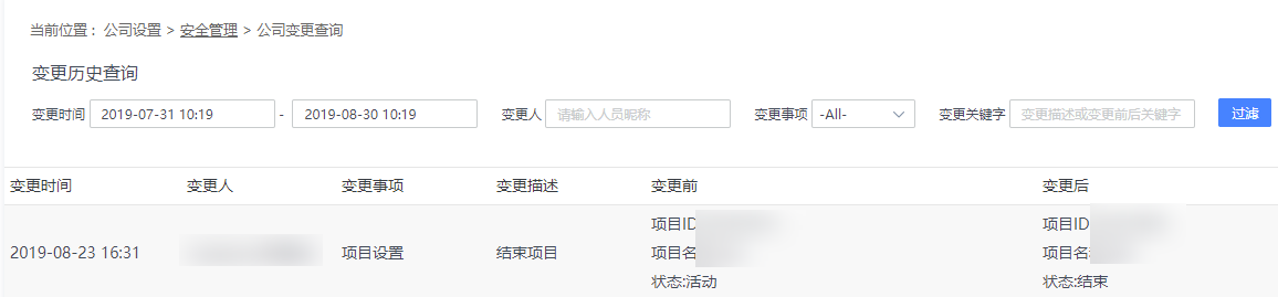 公司设置 > 安全管理 > 公司变更查询