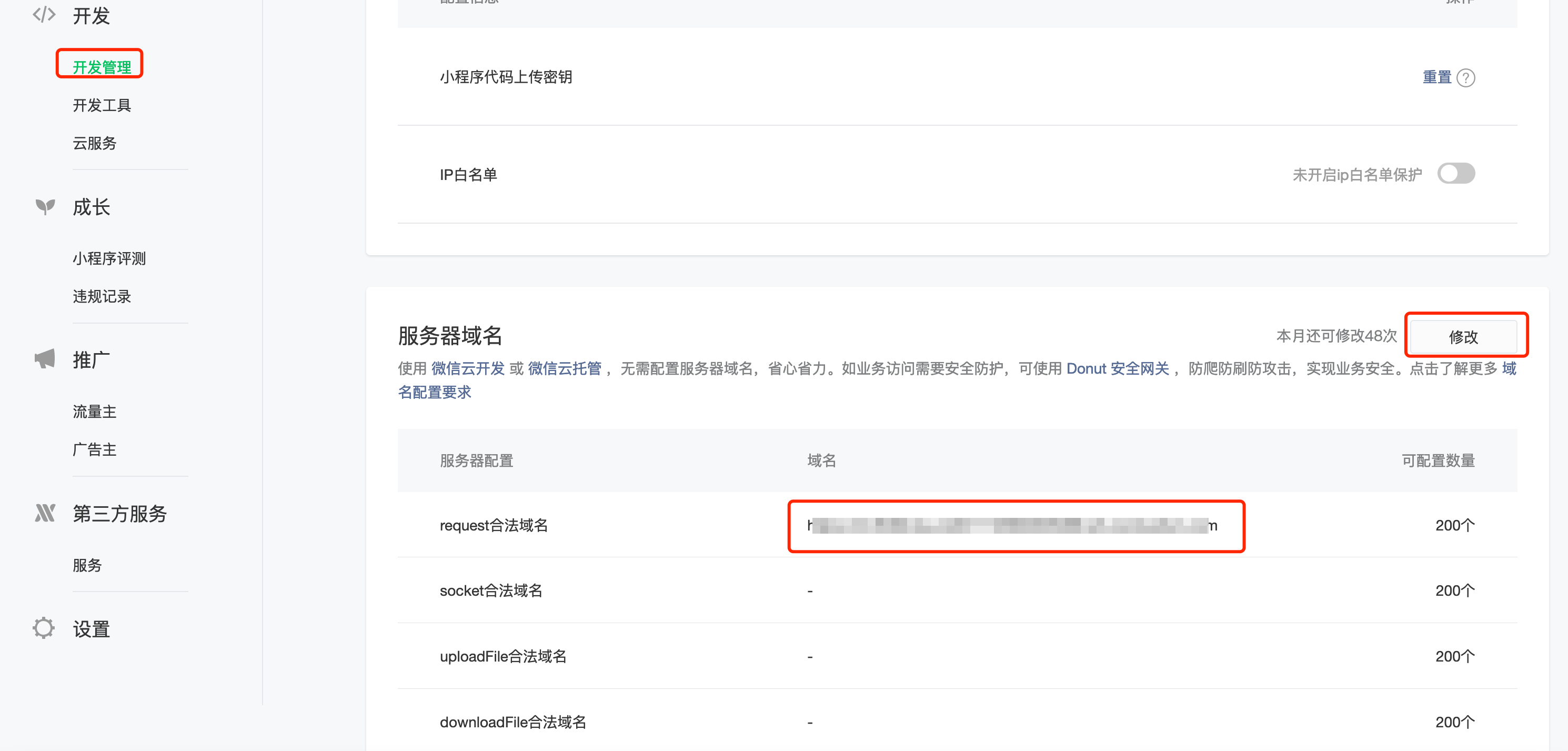 2.2 前往 微信公众平台,在开发管理中修改服务器域名,将网关的接入域名新增到小程序合法域名列表中。