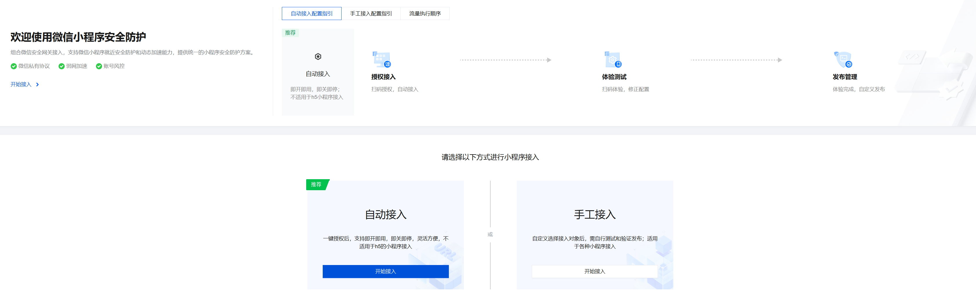 1. 在 小程序安全防护 > 小程序接入页面,选择自动接入,单击开始接入。