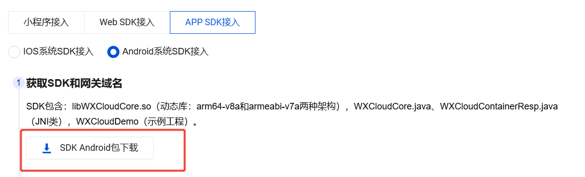 前往客户端配置页面,下载 SDK Android 资源包。SDK包含: