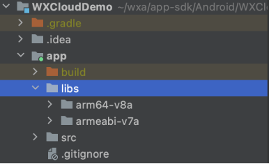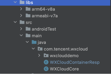 libWXCloudCore.so(动态库:arm64-v8a和armeabi-v7a两种架构),WXCloudCore.java、WXCloudContainerResp.java(JNI类),WXCloudDemo(示例工程)。