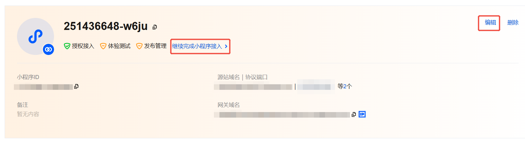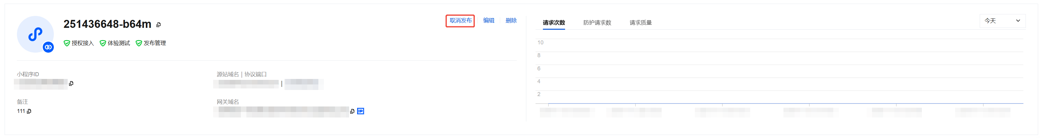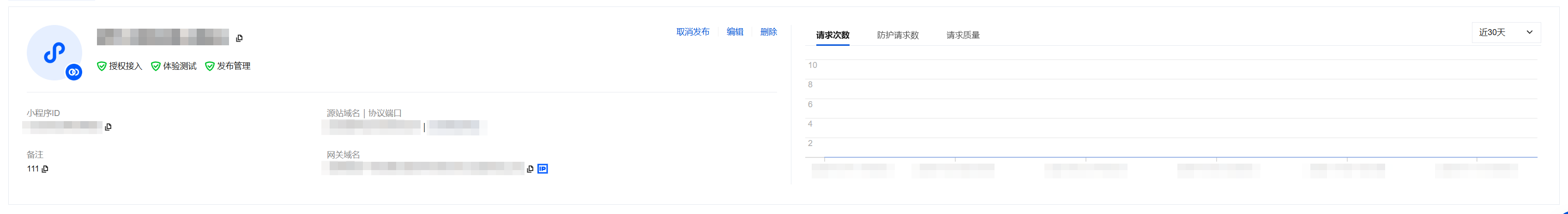 重新发布:取消发布后,单击小程序卡片中的编辑或继续完成小程序接入,即可唤起发布管理页面,重新发布后,将线上版小程序请求重新接入小程序安全防护功能。