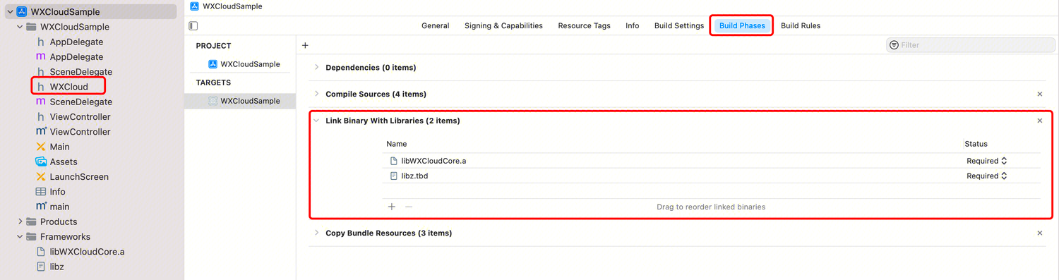 WXCloud.h(头文件),libWXCloudCore.a(静态库),WXCloudSample(示例工程)。