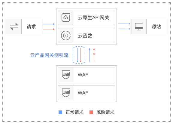 云原生 API 网关与云函数实例:通过云原生 API 网关控制台:微服务平台控制台-云原生 API 网关(详情请参见 云原生 API 网关产品文档)和云函数控制台开启 WAF 防护,以及 WAF 控制台域名接入中配置域名后,对经过云原生 API 网关和云函数网关的 HTTP/HTTPS 流量进行旁路威胁检测和清洗,实现业务转发和安全防护分离。