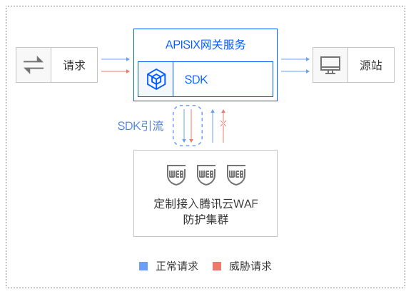 APISIX 网关服务:APISIX 网关集成 SDK,转发业务流量至腾讯云 WAF 集群(需要定制接入)。