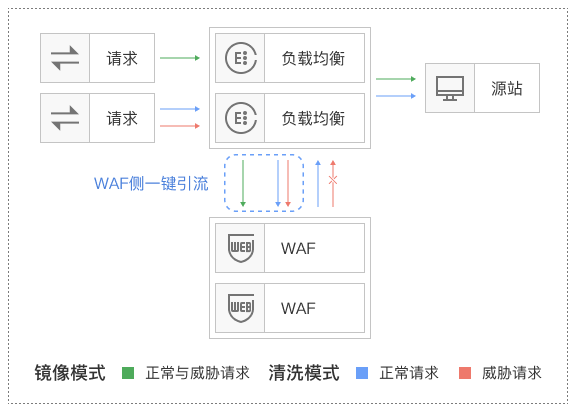 负载均衡 CLB 实例:通过在 WAF 控制台域名接入中配置域名和七层负载均衡 CLB(监听器)资源,对经过负载均衡实例监听器的 HTTP/HTTPS 流量进行旁路威胁检测和清洗,实现业务转发和安全防护分离。
