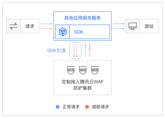 其他应用网关服务:客户网关集成 SDK,转发业务流量至腾讯云 WAF 混合云防护集群。