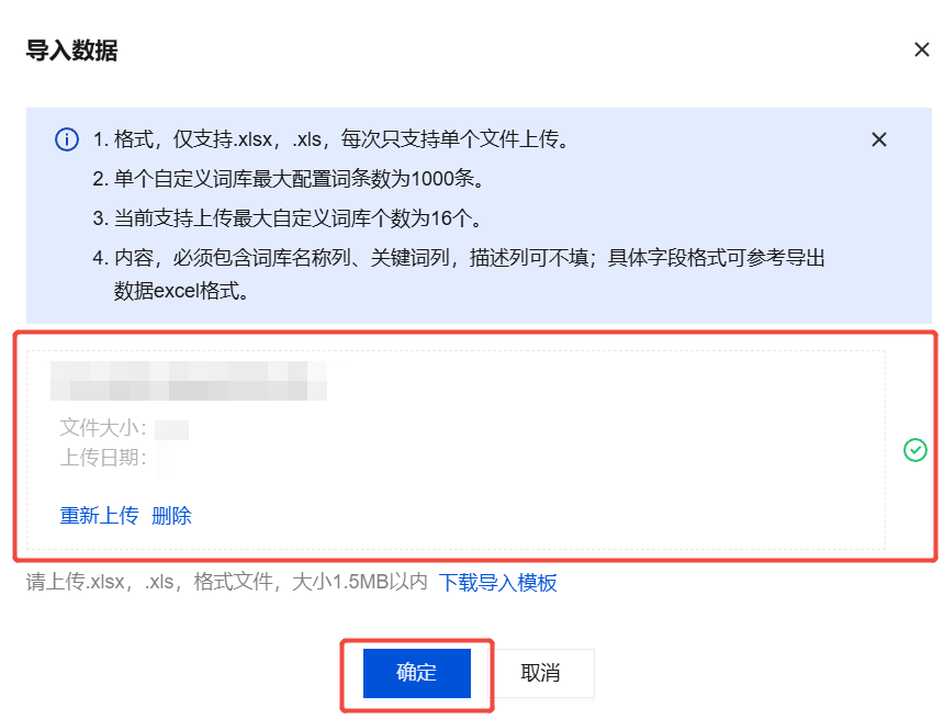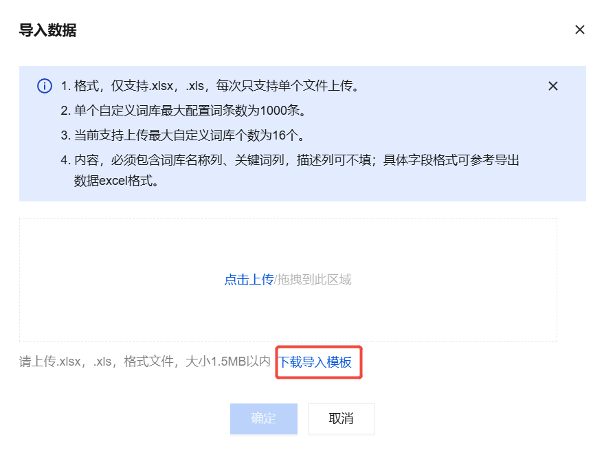 2. 单击下载导入模板,按照模板内的提示配置关键词库相关参数。