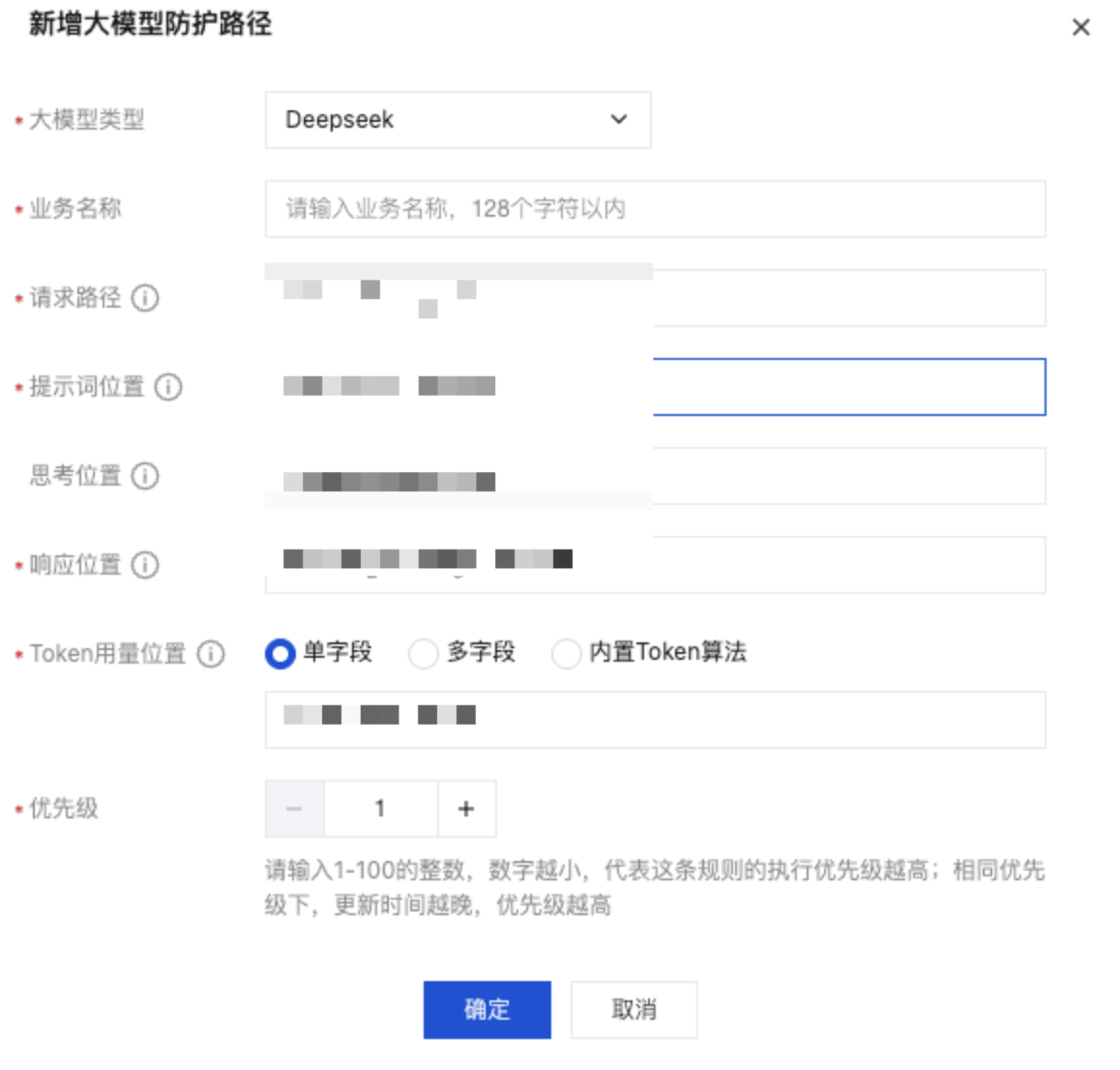3. 在新增大模型防护路径窗口中,配置相关参数,单击确定。