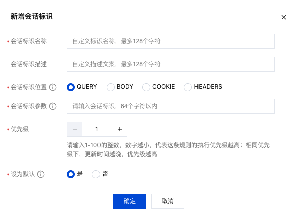 优先级 | 支持输入1-100的整数,数字越小优先级越高,优先匹配对应设置的会话标识。优先级相同时,更新时间越晚越优先。 |