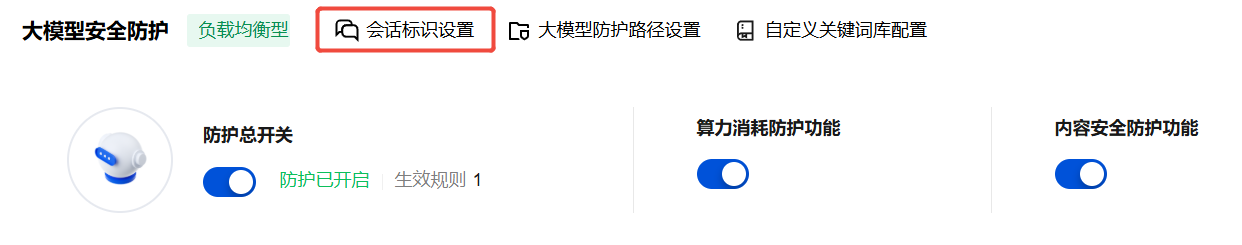 1. 大模型业务拦截需要针对单个用户维度进行风险识别和拦截,实现在同一 IP 下区分不同用户的精准处置。因此需要配置会话标识(Session ID)。您可以前往 大模型安全页面,单击会话标识设置进行配置。