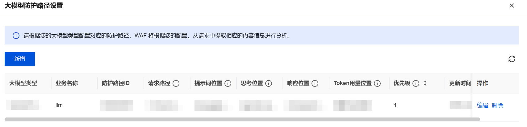 2. 单击新增,您可以设置大模型防护路径。