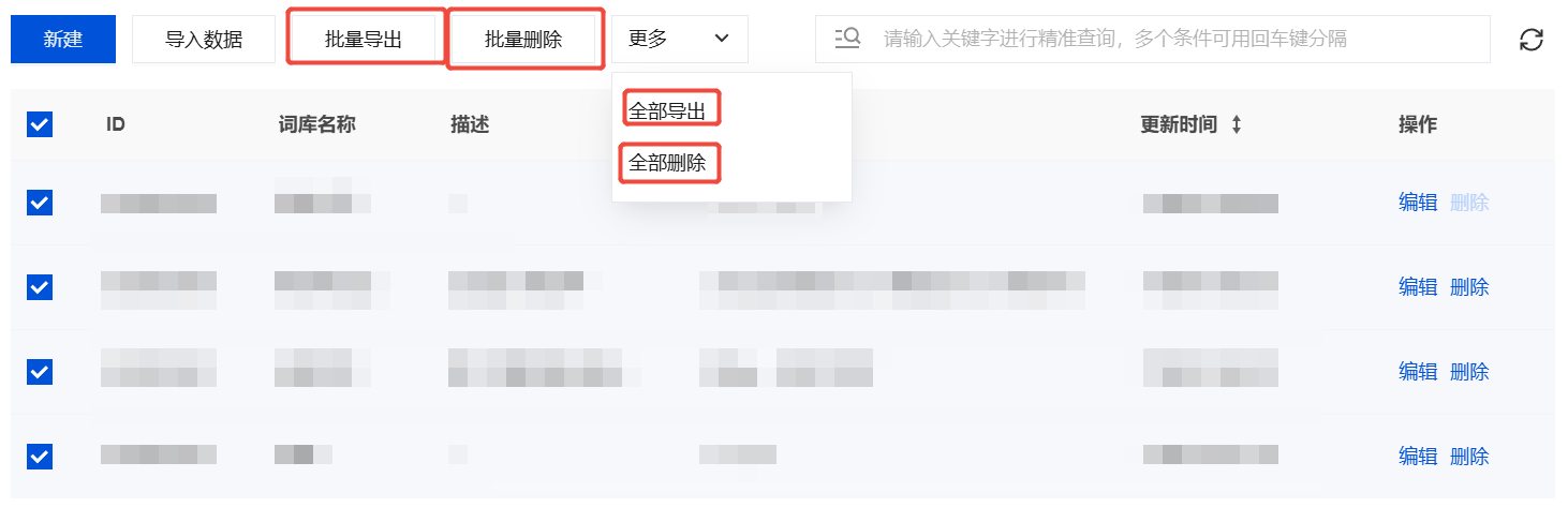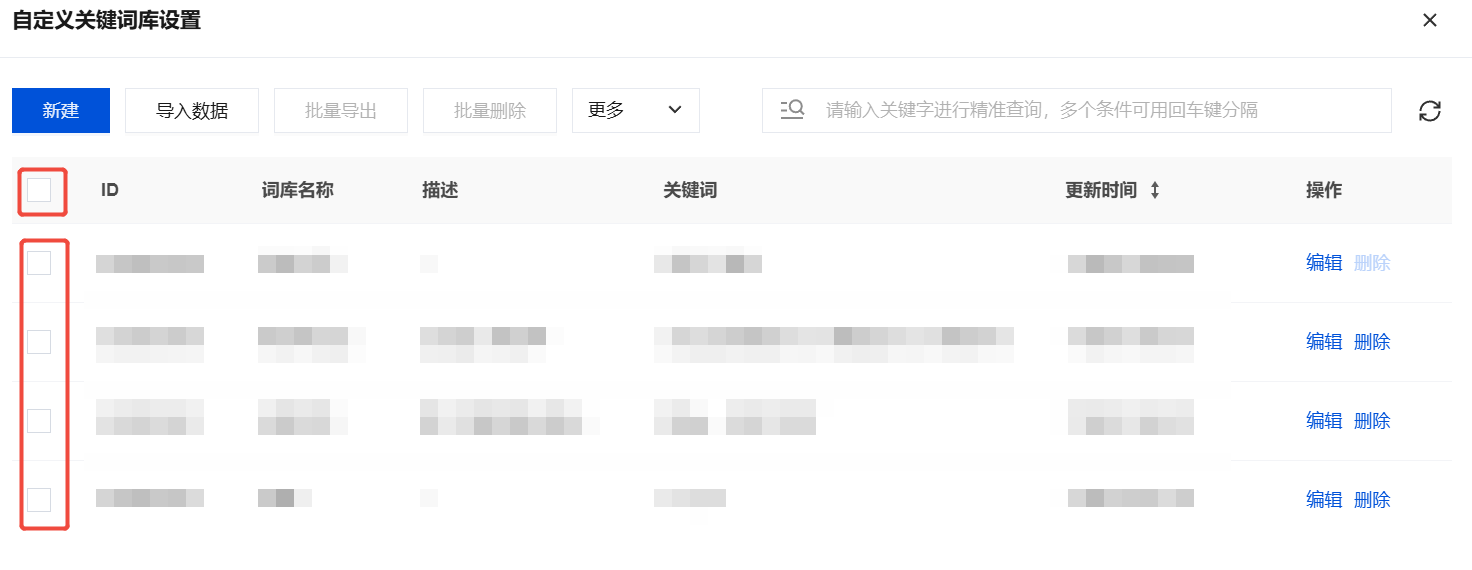 1. 在自定义关键词库设置页面,勾选需要导出或删除的单个或多个关键词库条目。如需批量选择当前列表中的所有关键词库,可直接勾选标题栏的"全选"复选框。