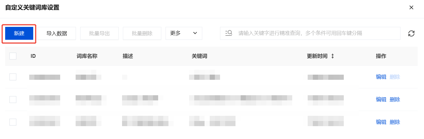 1. 在自定义关键词库设置页面,单击新建,您可以构建自定义关键词库。