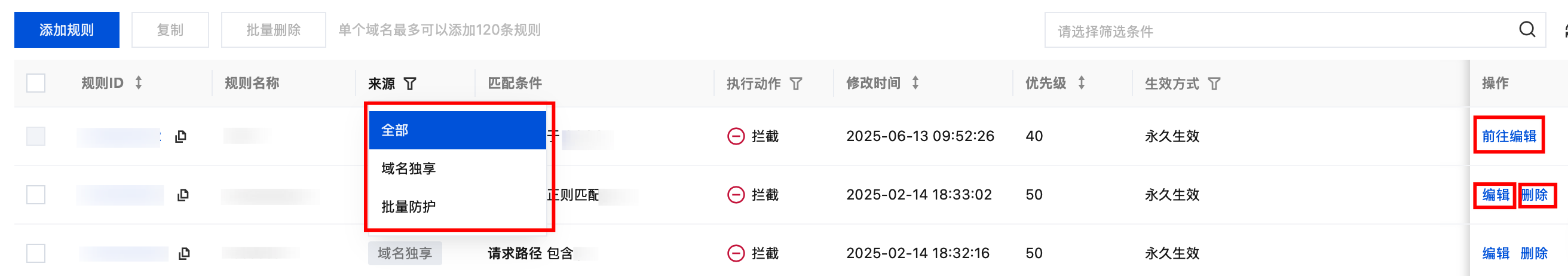 在 基础安全-访问控制页面,用户可直接编辑或删除域名独享规则,批量防护规则需前往批量防护规则模块进行操作。